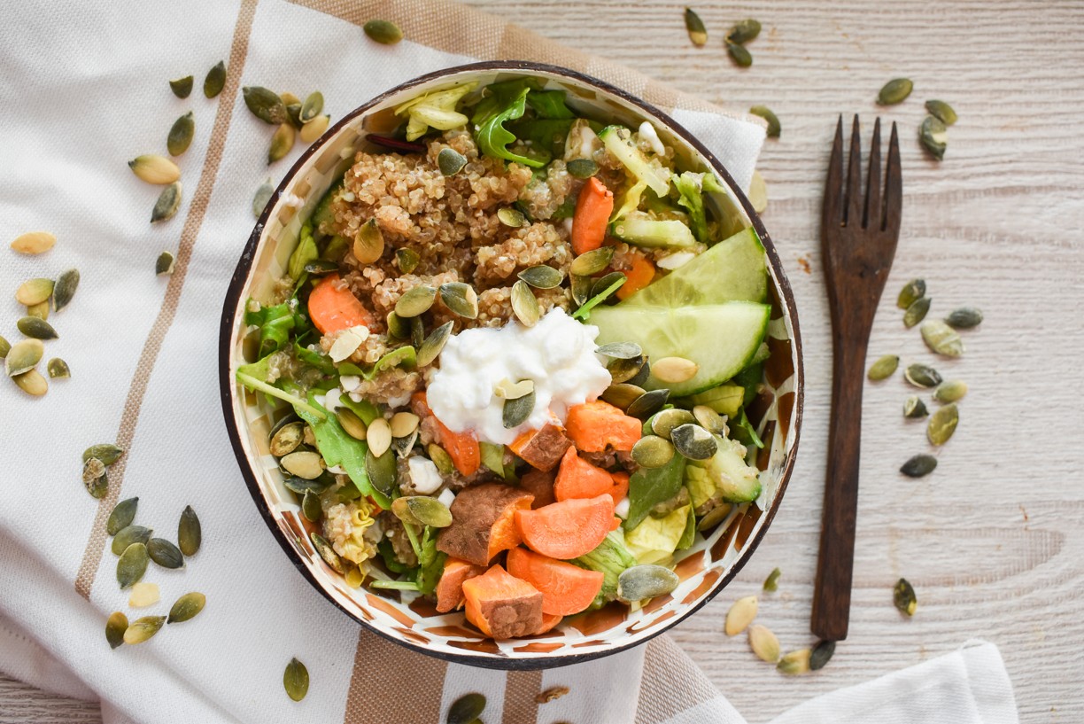 Nyní nám už jen zbývá poskládat si svojí výživnou Buddha bowl! Jako postýlku použijeme připravený salát, naskládáme na něj quinou, nakrájenou batátu a zbylou část Cottage, posypeme oblíbenými semínky a máme hotovo! Nyní už jen kokosovou vidličku do ruky a můžeme podávat.